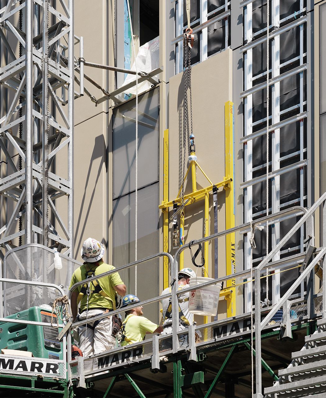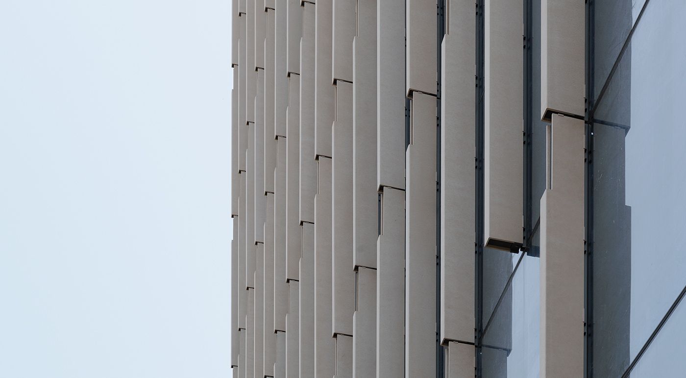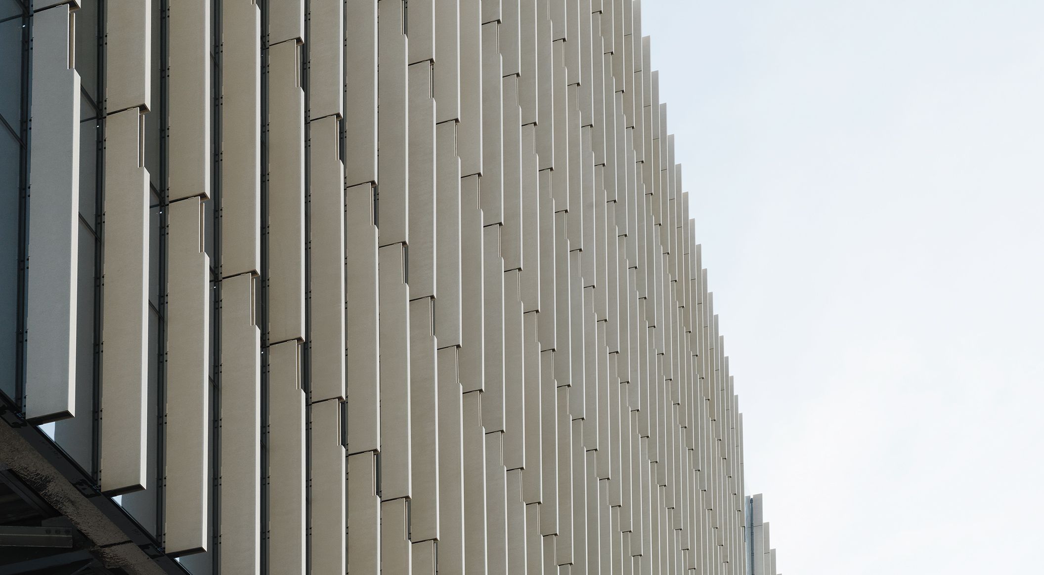 Using Rieder slim concrete elements with an integrated fastening system permits for the first time the use of concrete for element facades. Individual form parts with a U-cross section are used as thin vertical concrete fins to produce a facade with contrasting typologies. Depending on the viewing angle, the facade appears transparent and opaque at the same time, due to the cantilevered concrete fins. The sandstone coloured concrete elements also function as sun protection. With the development of its own fastening system, Rieder made it possible to quickly assemble the 1,300 U-shaped parts made of glass fibre concrete. The pre-assembly of the fixing anchors ensured quick and weather-independent assembly on site. The form parts were simply attached to the substructure and then finetuned. Due to the low weight of the only 13 mm thin elements and the high spans up to 4.25 m, less material was required for the substructure. Photos: Ditz Fejer